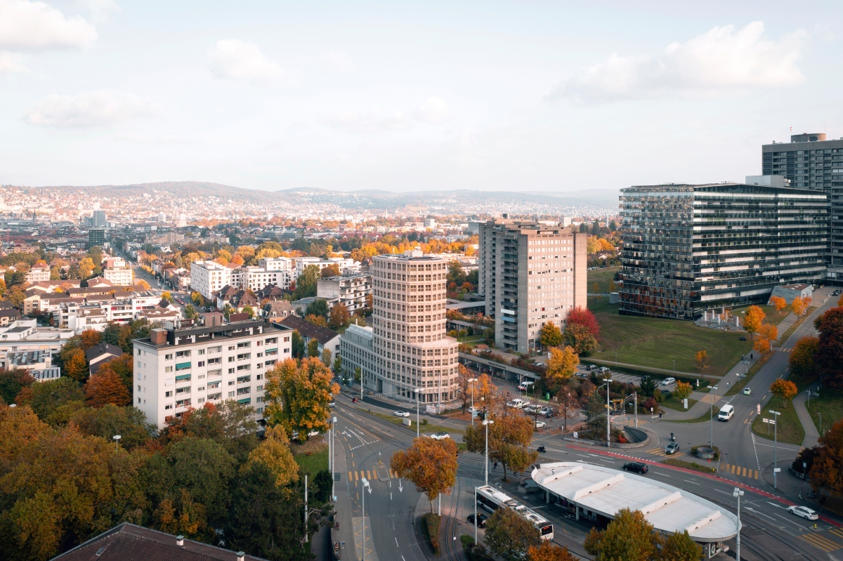 EMI Architekt*innen haben ein Wohnhochhaus am nördlichen Ende des Quartiers Friesenberg und direkt unterhalb des Uetlibergs geplant. Das 40 m hohe Haus passt in seiner markanten Form sowie mit der einheitlichen Farbgebung der Beton- und Blechfassaden zu den benachbarten Großbauten aus den 1960er-Jahren, ist jedoch erst auf den zweiten Blick als Wohnungsbau erkennbar.