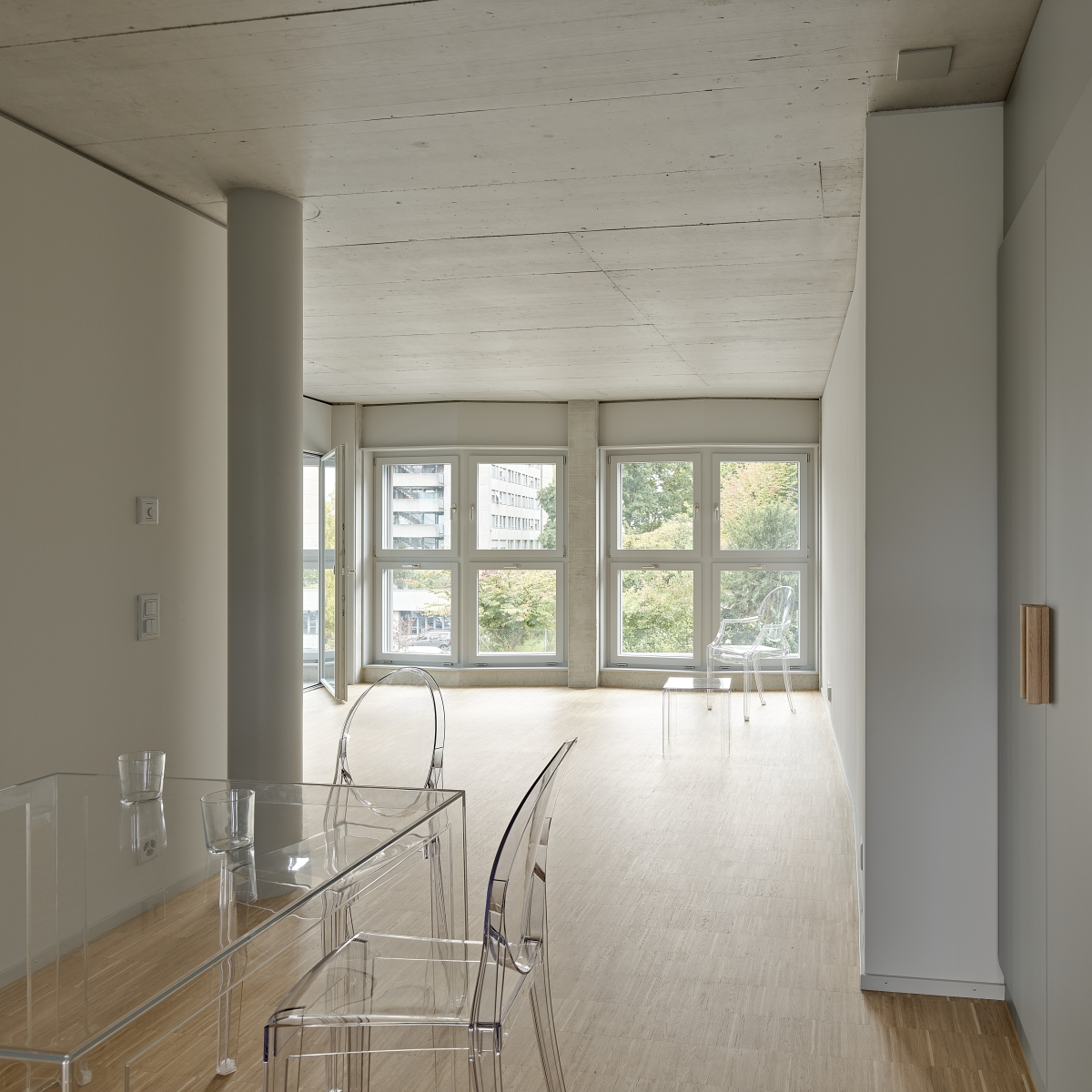 Pro Regelgeschoss gibt es vier Wohnungen, jeweils zwei an der Südfassade und zwei mit Ausblicken in mehrere Himmelsrichtungen. In diesen zeigt sich die Qualität des Skelettbaus: Wenige Stützen stehen in den Räumen, die Wände sind frei gesetzt. Weil es in den meisten Wohnungen keine Zimmertüren gibt, werden auch die kleinsten Grundrisse mit etwa