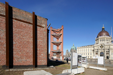 Klar, aber ohne ginge es natürlich nicht. Natürlich lassen wir Spielräume zu, die auch auf die Zielkonflikte reagieren, historische Eins-zu-eins-Rekonstruktion der Fassade und ihr CO2- Fußabdruck beispielsweise, der sich heute ja darstellt in der Produktion, dem Transport, Aufbau und späterem Rückbau. Was in der Diskussion klar wurde, ist, dass wir mit diesem Gebäude ein überzeugender Teil des 1,5-Grad-Ziels sein wollen. Also ein klimagerechtes Gebäude. Dann wollen wir auch ein offenes Haus, das mit dem Quartier verwoben ist, in das jeder kommen kann und gerne kommt. Das sind hehre Ziele, denen wir uns stellen. Und natürlich wollen wir auch dem historischen Ort gerecht werden. Den Wettbewerbs-teilnehmer:innen ist es aufgegeben, mit ihrem Vorschlag den bestmöglichen Konsens aus diesen ganzen unterschiedlichen Anforderungen zu finden, mit einer kreativen Lösung, die einerseits Schinkel gerecht wird und andererseits auch den Anforderungen der heutigen Zeit, die aus dem anstehenden Klimawandel resultieren.
