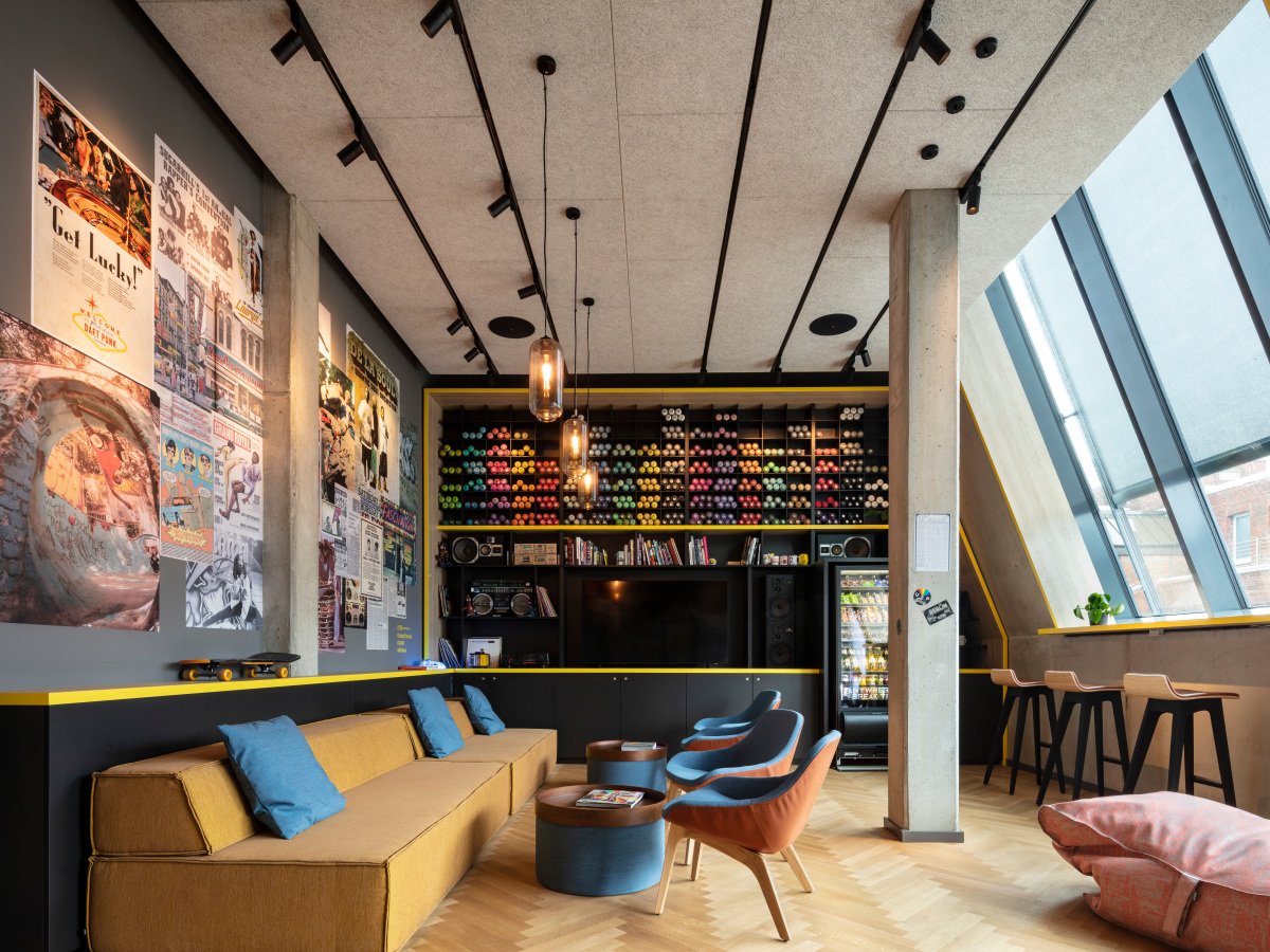 Im gesamten übrigen Hotelbereich hat sich der Innenarchitekt bei seiner Gestaltung an der Zwischennutzung des Gebäudes orientiert. Von 2013 bis 2014 wurde nämlich das ehemalige Autohaus als Kulturprojekt B20 unter anderem von Streetartkünstler:innen für Ausstellungen genutzt. Abgesehen davon, dass nun die Treppenhäuser und die Erdgeschoss-