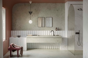 Die 3D-Ink‑Technologie, die erstmals auf dem Feinsteinzeug in Marmoroptik von The Top zur Anwendung kommt, erzeugt leichte Furchen an den Aderungen, was die Tiefenoptik der Materialzeichnung verstärkt. Jura ist vom Fränkischen Jura aus der Fränkischen Alb inspiriert. Die bei diesem Stein typische Varietät aus Meeressedimenten ist durch eine gleichmäßige Grafik sowie etliche fossile Muscheln und Rückstände gekennzeichnet, die der Oberfläche ein abwechslungsreiches Aussehen verleihen. Der brasilianische Quarzit wird von Infinity in der tiefdunklen Farbe Anthracite interpretiert. Kiesel in verschiedenen Größen weisen eine dezente Ton-in-Ton-Nuancierung in Kombination mit zarten Aderungen auf.