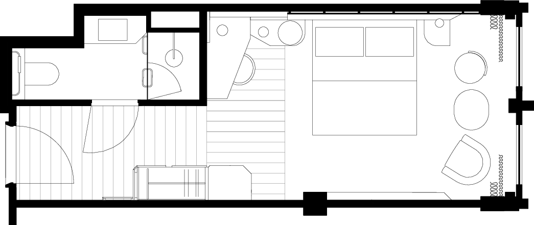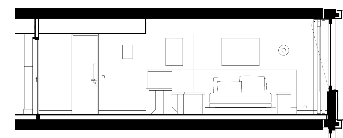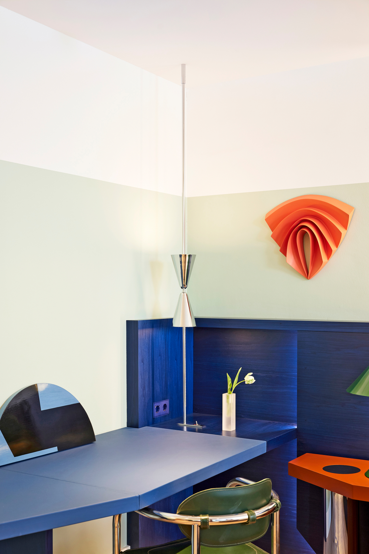 Dieser Anspruch betrifft vor allem die Zimmer mit ihrer gradlinigen, schnörkelfreien Formsprache, die immer wieder abgeschrägte Ecken aufweist und den Gästen so etwas mehr Bewegungsfreiheit verschafft. Farblich werden dazu ein sattes Blau, Rot oder Grün eingesetzt, was der ansonsten hellen Atmosphäre eine gewisse Gemütlichkeit verleiht. Um dabei die unterschiedlichen Einrichtungsgegenstände in Beziehung zu setzen, zieht sich diese Farbwelt über die verschiedenen Oberflächen. So sind beispielsweise Einbauten in Zimmer und Bad sowie Sessel oder Kissen in Blau oder Rot gehalten, Stühle oder Nachtischleuchten dafür in Grün. Boden und Farbflächen an der Wand sind dagegen heller ausgeführt, was die kräftigen Farben betont, ohne diese zu schwer zu machen. Chrom-Akzente lösen die geometrischen Formen etwas auf und verleihen einen postmodernen Touch.