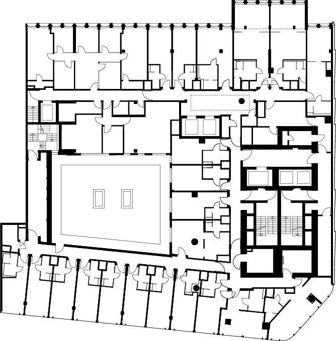 Das Kimpton bietet dabei gehobene Hotellerie in dem funktionsgemischten Neubau an, der auch Wohnen, Gewerbe und natürlich Büroflächen im Angebot hält. Untergebracht ist das Hotel mit dem angeschlossenen Restaurant Anni und der Dachgastronomie Lazuli dabei in dem für die Öffentlichkeit aufgebrochenen und durchwegbaren Sockel. Wer einen Blick in den ausführlich dokumentierten Bauprozess wirft, wird feststellen, dass lediglich die Fassade des Hotels noch original ist; der Rest, also der gesamte dahinter geschaffene Hochbau, ist neu. Die Fassade ist im Verhältnis zu den abgerundeten, etwas futuristisch wirkenden Türmen geradezu nüchtern und verschafft zumindest dem Kimpton einen Hauch von historischer Geltung.