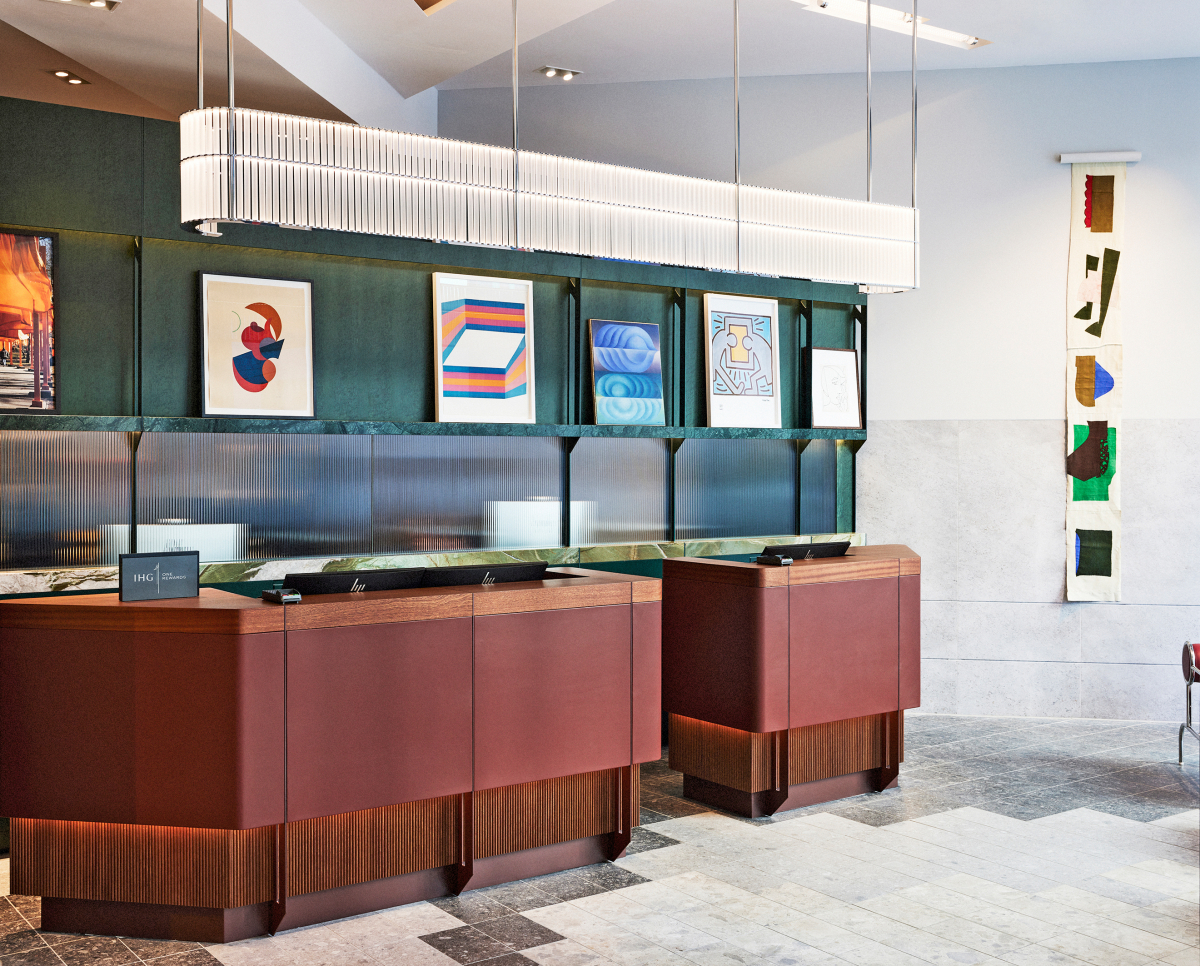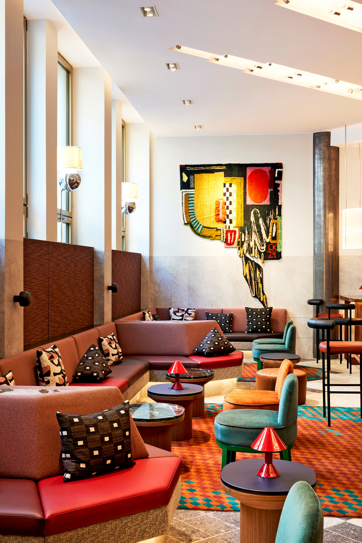 Ähnlich satt in den Farben, aber dafür stärker texturiert, geht es im Empfangsbereich im Erdgeschoss zu. Auch hier finden sich kräftige, allerdings dunklere Blau- und Rottöne, gemischt mit erdigen Farben und dazu natürlichen Oberflächen aus Stein oder Holz. Diese kommen beispielsweise für die Tische zum Einsatz, deren Form volumetrisch etwas an den oberen Teil einer dorischen Säule erinnern, mit einer Naturstein-Tischplatte als dünnem Abakus. Die runde Form wird auch für Sessel und Poufs aufgegriffen und weicht die recht geometrische Formensprache angenehm auf. Der etwas kalte, quadratisch gepixelte Boden findet sein Pendant in den rautenartig abgestuften Deckenleuchten, die in die Decke eingelassen sind und von Dan Flavins Arbeit inspiriert wurden, wie Bartlett erläutert. Um die Eingangssituation noch gastlicher zu machen, kommen zudem textile Oberflächen wie Teppiche zum Einsatz, was sich über die Sitzbänke bis zur Kunst an der Wand durchzieht.