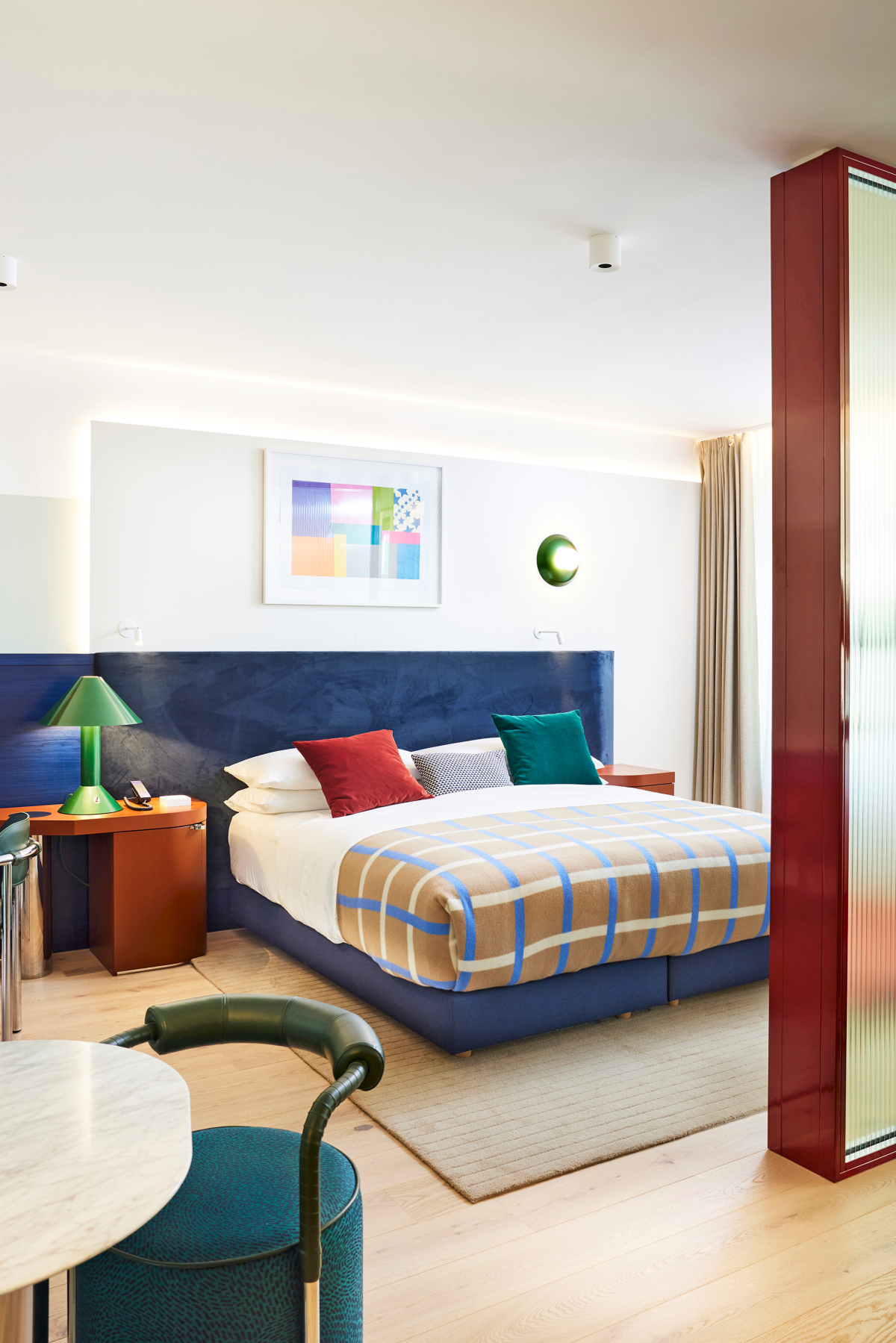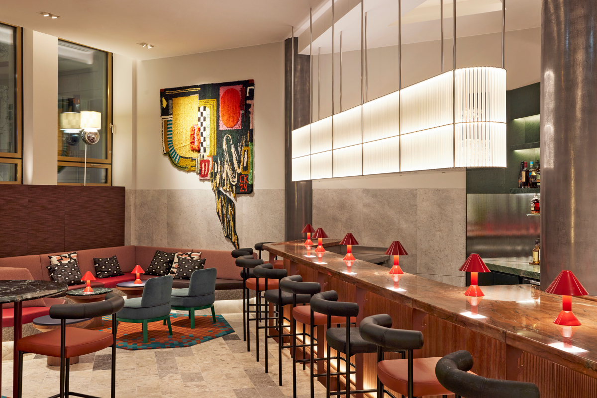 Die Gestaltung des Hotels wurde dabei inspiriert vom frühen Weimarer Bauhaus mit seinem handwerklich geprägten und interdisziplinär ausgerichteten Kosmos aus Formen und Farben. „Wir haben uns am Anfang des Entwurfsprozesses gefragt, welche Inspirationen wir aus Deutschland für das Projekt einfließen lassen könnten, um einen lokalen Bezug herzustellen und sind natürlich auf das Bauhaus gekommen“, erzählt Tom Bartlett von Waldo Works aus London, die federführend für die Inneneinrichtung waren. „Während meiner ersten drei Semester im Studium in Manchester habe ich einen Kurs zum Bauhaus gemacht“, so Bartlett. Ihm sei daher die Idee eines „handmade Modernism“ wichtig gewesen, der unterschiedliche Materialien aufnimmt und vom Möbel über die gewählten Kunstwerke bis zum Detail reicht.