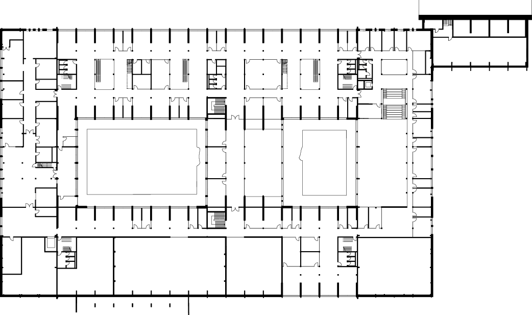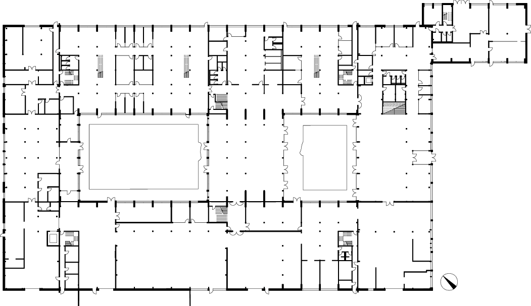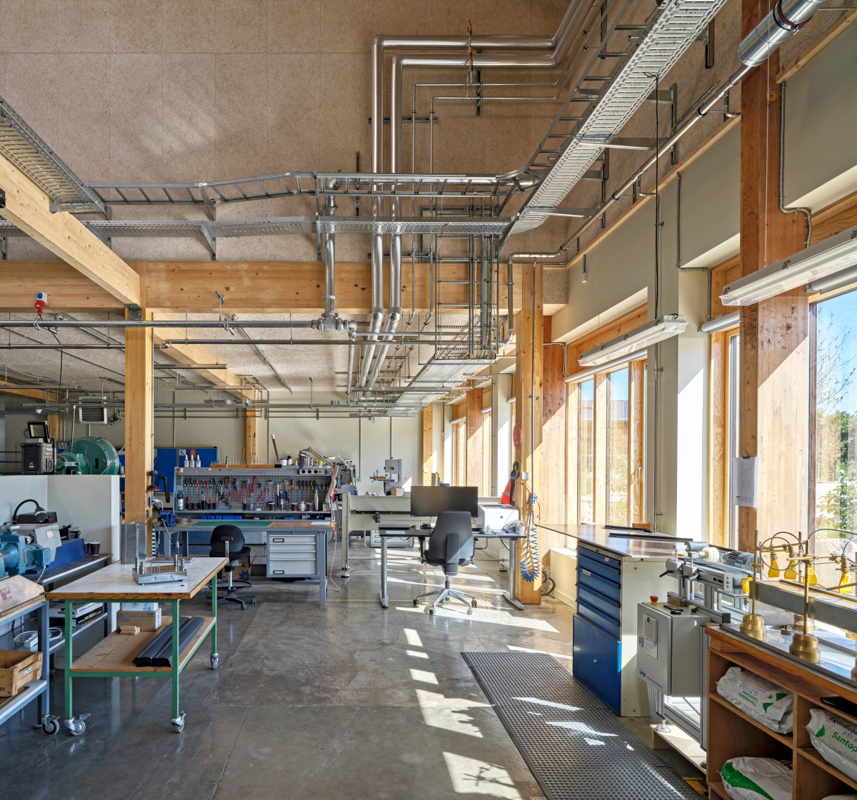 Das LKR (Lars Kann-Rasmussen) Innovation House vereint daher zahlreiche Funktionen unter – je nach Zählweise – einem bis sechs Dächern: In der südlich gelegenen Teilhalle sind Werkstätten untergebracht, in der nördlichen Büroflächen nach der New Work-Philosophie mit zahlreichen unterschiedlichen Platzangeboten für Intensiv- und Gruppenarbeit, Versammlungen und Videokonferenzen. Hier finden auch Beschäftigte aus dem Personal- und Finanzwesen einen neuen Schreibtisch, wenn auch keinen „eigenen“, um den Austausch mit der Forschungs- und Entwicklungsabteilung zu befördern. Die ist im Wesentlichen im westlichen Gebäudeteil untergebracht und damit genau zwischen Werkhallen und Büros. Das Zentrum des Gebäudes bildet der Kantinenkomplex als Begegnungsraum für alle Gewerke. Der östliche Mittelteil schließlich wird als Foyer, Showroom, Galerie, Meetingraum und Lounge genutzt und gehört zu den öffentlicheren Räumen, ebenso wie das leicht versetzt vorgelagerte Forum, das für ganz ähnliche Anlässe genutzt wird. Explizit ohne Überdachung bleiben die beiden begrünten Innenhöfe, die durch neu geschaffene Fensterfassaden im Mittelschiff einsichtig und zugänglich sind.