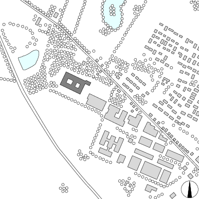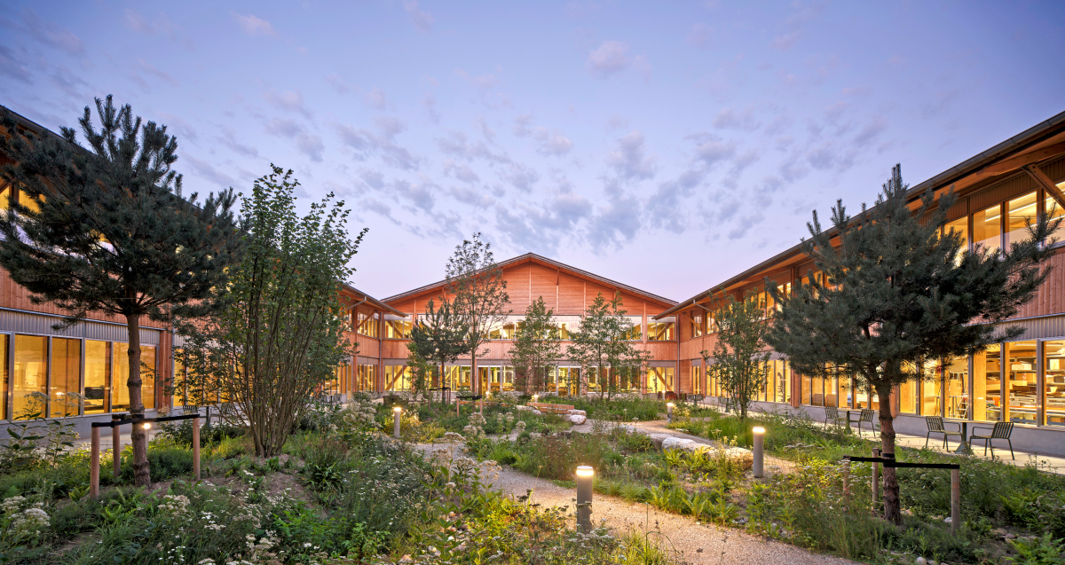 Immerhin konnte der alte Werkboden gerettet werden, in dem entlang der Außenwände ein 80 cm breiter Streifen ausgegraben und isoliert wurde. Und da die Heizenergie eine Wärmepumpe liefert, die ein eigenes Gebäude auf dem Firmengelände einnimmt, und der Strom aus einer werkseigenen PV-Anlage stammt, sei die Energiebilanz insgesamt noch besser als nur vertretbar. Insbesondere wenn man die Graue Energie in Betracht zieht, die bei Abriss und Neubau der Hallen freigesetzt worden wäre. Mit mineralischer und, wo immer möglich, Holzwolle-Dämmung in Dach und Außenwänden sowie dreifach-verglasten Fenstern ist das einstige Kaltlager heute ein behaglicher Ort, der sich dennoch zum Außenraum öffnet. Mehr als 400 Velux-Fenster in Dach und Fassade versorgen den Komplex zentral und abschnittsgesteuert mit Licht und Frischluft. „Teil des Konzepts, mit dem sich Team Praksis beworben hat, war zudem die Landschaftsgestaltung um das Gebäude. Mit der Besonderheit, dass die Landschaft nicht nur um und zwischen den Gebäudeteilen gestaltet wurde, sondern sich auch durch die Räume zieht“, sagt Lone Feifer. Dazu wurde im Foyer eigens eine Baumscheibe aus dem Werkboden geschnitten. Immer wieder tauchen im Gebäude Bäume in großen Pflanzmöbeln auf. So verzahnt die Vegetation nun optisch Innenräume, die begrünten Innenhöfe und den nördlich gelegenen, öffentlich zugänglichen Park miteinander. Als Willkommensgeste umschmeicheln außen weitere Baumscheiben, geschwungene Wege und Pflanzungen das LKR, was die monumentale Klotzigkeit des Ursprungsbaus deutlich entschärft.