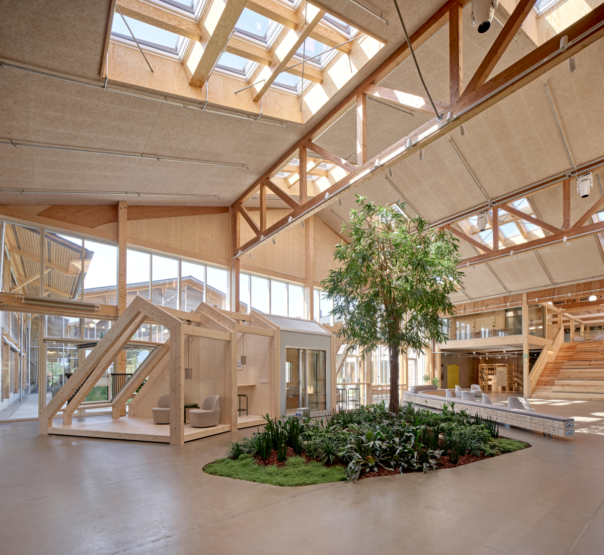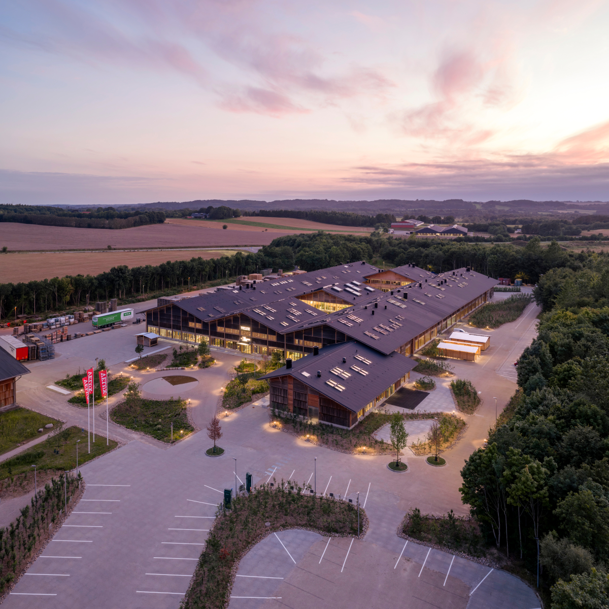 Auf die Heldentaten der Vergangenheit wollte man sich im immer noch familiengeführten Imperium (rund 2,96 Mrd. Euro Umsatz im Jahr 2024) noch nie verlassen: Schon 1994 erkannte der Sohn des Firmengründers die Zeichen der Zeit und errichtete auf dem Firmengelände in Østbirk ein Kaltlager mit drei Hallen in Holzbauweise. „Damals war das ein gewagtes Experiment, da zu diesem Zeitpunkt kaum jemand Erfahrung mit Holzbauten in diesem Maßstab hatte“, erzählt Lone Feifer, Architektin und Leiterin für nachhaltiges Bauen in der Velux Gruppe. „Und so war es auch gemeint. Lars Kann-Rasmussen hatte bei einem Vortrag in Birmingham die Mahnung gehört, wer künftig nicht mit Holz plane, trage zum Untergang des Planteten bei und wollte mit den Lagerhallen seinen Teil zur Entwicklung der Bauart beitragen.“
