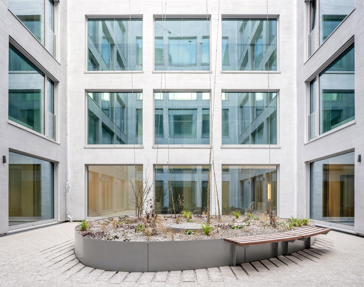 Der Gestaltungswille aller Beteiligten findet indes auch im Außenraum kein Ende. Wichtig war den Nutzerinnen und Nutzern zum Beispiel, dass Teile des alten Baumbestands in die Landschaftsgestaltung einbezogen wurden. Gefällte Stämme wurden zu Bänken verarbeitet. Eine große Eiche vor dem Foyer entwickelte sich im Zuge der Grabungsarbeiten zu einer besonderen Herausforderung, da die Grube für die unter­irdischen Technikräume direkt bis an deren Wurzeln heranreichte – sie überlebte und setzt heute einen Akzent in den zahlreichen Blickbeziehungen zwischen den Fassaden. Die Leipziger Landschaftsgärtnerin Claudia Scheffel tat das Ihrige, um die Topografie der Architektur in eine terrassierte Campuslandschaft zu übersetzen: Platzflächen aus Betonpflaster mit Rasenfugen an den Rändern, Treppen, Beete und Sitzmauern aus Beton und Stampfbeton mit Zuschlägen aus regionalem, rötlichem Porphyr begrenzen den Komplex am südlichen Ende. Die sich durch den Altbestand schlängelnden Wege verstärken den Campuscharakter. Und mit dem Frühlingserblühen dürfte die Adressbildung am Weinberg ihren vorläufigen Höhepunkt erreichen.⇥ Jan Ahrenberg/DBZ