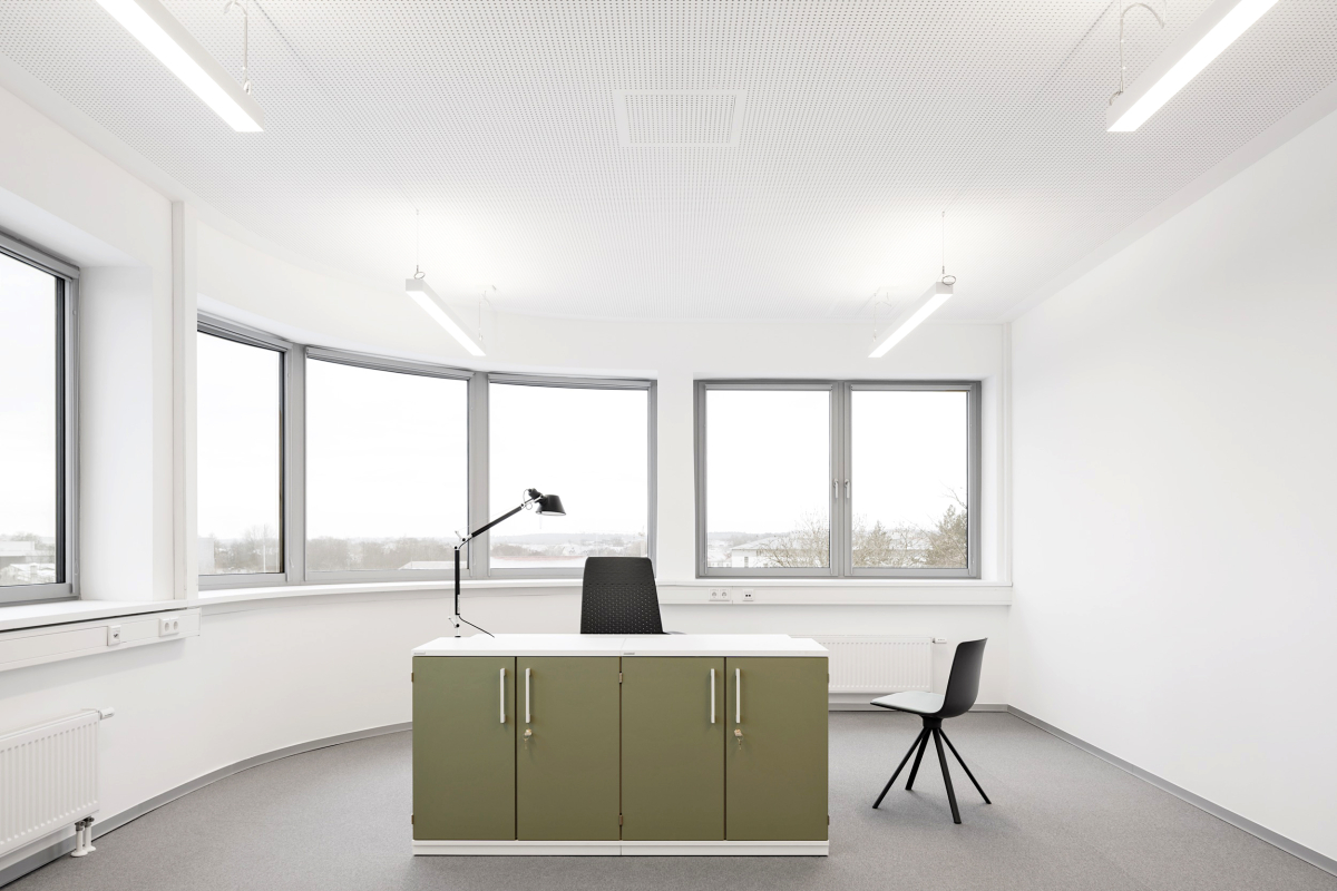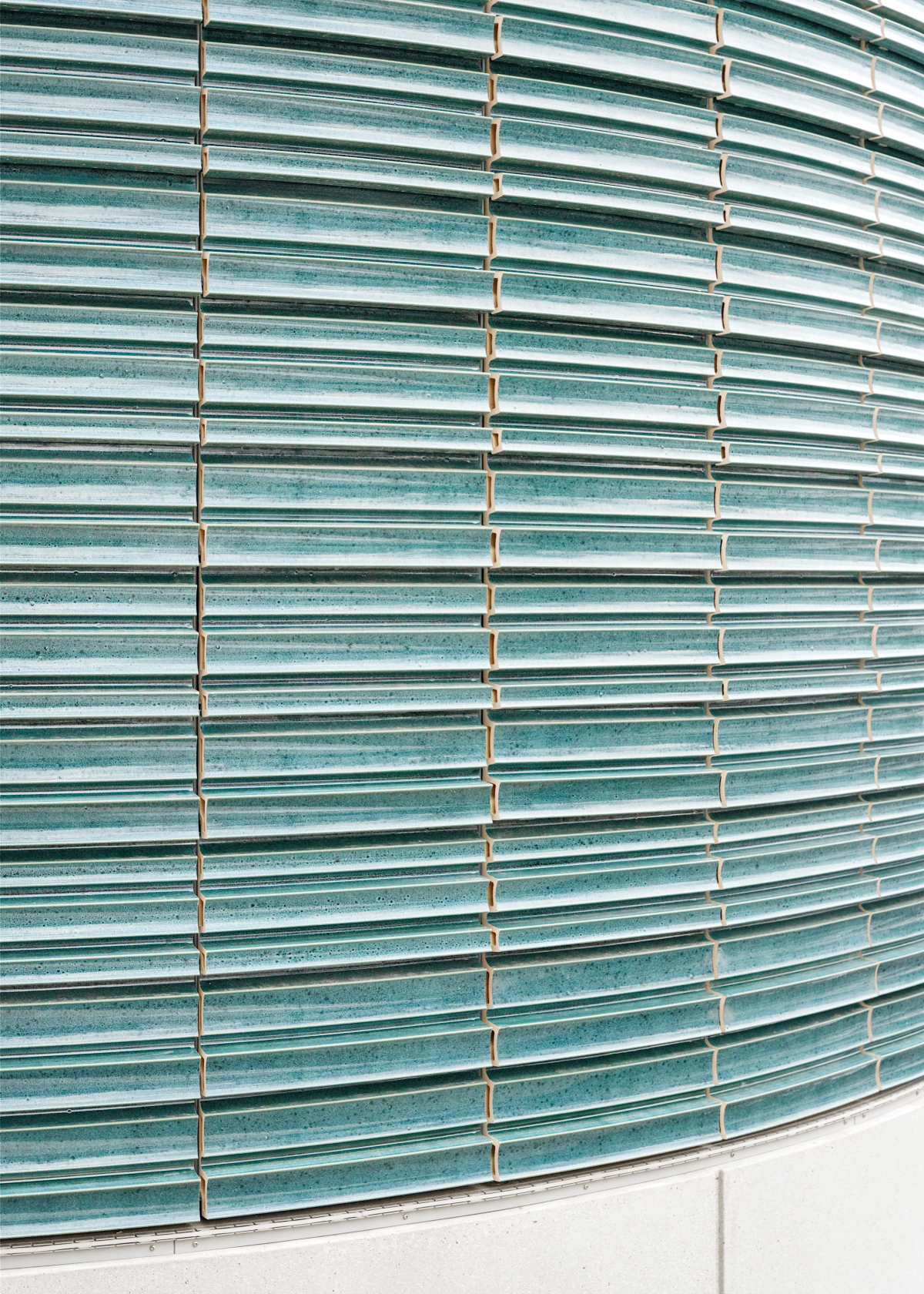 Bei aller Vielfalt im Inneren verfolgten die Planer dennoch das Ziel, das Ensemble äußerlich zu einem harmonischen Ganzen zu fügen: „Dabei standen wir vor der Herausforderung, dass wir die Fenster in der Bandfassade des Labortrakts und die der Lochfassade des Bürotrakts nicht auf eine Ebene bringen konnten“, sagt Werner. „Deshalb kamen wir auf die Idee, die Trakte durch ein umlaufendes Fassadenband zusammenzubinden.“ Auch das war leichter gesagt als getan. Die Höhenversätze zwischen den Ebenen wurden vor allem in den Gebäudeecken zum Problem. „Fast wären wir daran gescheitert. Doch letztlich haben wir mithilfe eines lokalen Fassadenbauers in mühevoller, handwerklicher Detailarbeit eine umlaufende Fuge für die Keramikfassade entwickeln können, darauf sind wir besonders stolz.“ Eine bauliche Zulassung für die Keramikplatten, die diese Lösung ermöglichten, lag zwar vor – allerdings nur für die gerade Variante. Für die runden Gebäudekanten mussten die Planer wiederum in die Trickkiste greifen und mehrere gebogene Platten so weit kürzen und stückeln, bis deren Radien innerhalb der Toleranzen lagen. „In die Fassade haben wir letztlich viel mehr Arbeit gesteckt, als wir uns vorgestellt haben“, resümiert Moritz Werner. „Aber der Mehraufwand hat sich gelohnt. Im Sonnenlicht changieren die mehrfach lasierten Keramikplatten und verbinden die Gebäudeteile so zu einem sowohl einheitlichen als auch dynamischen Gebäudekomplex.“↓