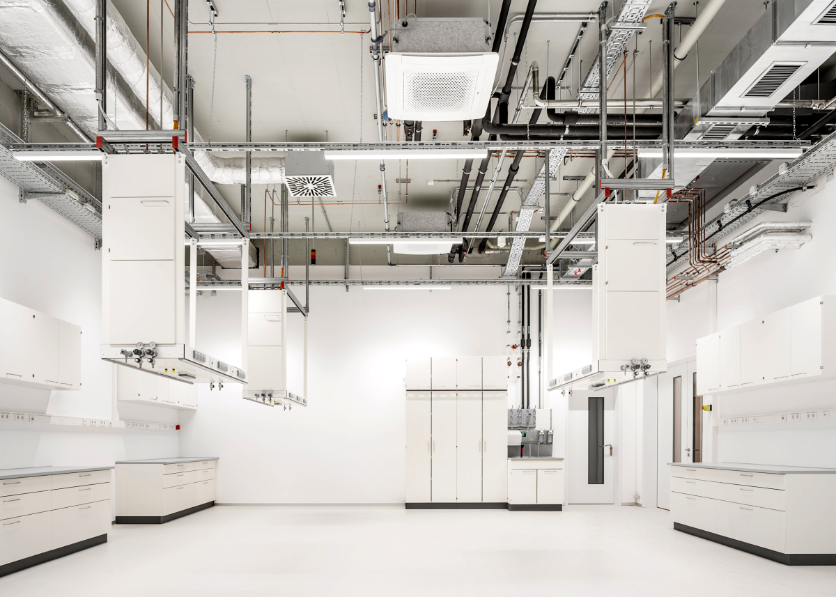 Dieser kleine Kniff erlaubte es den Planerinnen und Planern in der Folge, das Optimum für jeden Arbeitsplatz herauszuholen: „Von der Mitte des Technikgeschosses in der obersten Etage des Labortrakts führt ein großer Medientunnel nach unten, mit dem die Laborarbeitsplätze direkt erschlossen sind. Dadurch konnten wir die Auswertungsplätze zur Fassade ­orientieren, die so mit reichlich Tageslicht versorgt werden“, erklärt Moritz Werner. Im UG sind weitere Technikräume und eine Kältezentrale untergebracht – Arbeitsprozesse und die dafür notwendigen Medien können ungehindert von den bautechnischen Anforderungen und Platzansprüchen fließen, die zum Beispiel Büroarbeitsplätze mit sich bringen.