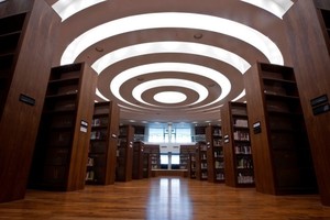 Teherani dazu, die Hauptfunktionen der Universität unter einer fließenden Dachfläche zusammenzufassen – einer Adaption des Schleiers. Auf ein Podest gehoben, bekommt die Bibliothek architektonisch eine besondere Bedeutung. Hadi Teherani orientierte sich bei seinem Entwurf und der Möblierungsanordnung am klassischen Amphitheater. Buchregale und eine Sitzreihe sind halbkreisförmig um eine runde Bühne angeordnet, während der Dozent bei Bedarf von der Mitte aus vortragen kann. Über eine Empore ist der Raum von oben einsehbar. Die konzentrische Anordnung der kreisförmigen Leuchten spiegelt den Einrichtungsgrundriss an der Decke wieder.