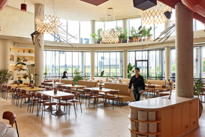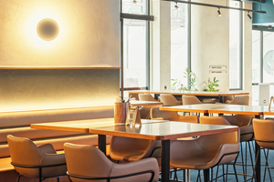 Die Lichtplanung unterstreicht die zonierte Struktur des Gebäudes und schafft Atmosphäre für unterschiedliche Nutzungsszenarien. In der Main Bar des Bistros kommen beispielsweise die Zoom KL Kronleuchter mit Scherengittern zum Einsatz und gliedern den doppelstöckigen Raum. Ergänzt werden sie von Cavity Decken- und Pendelleuchten, deren Sonderfarben teilweise an das Interior angepasst sind. Insgesamt wurden vier Sonderfarben eingesetzt.