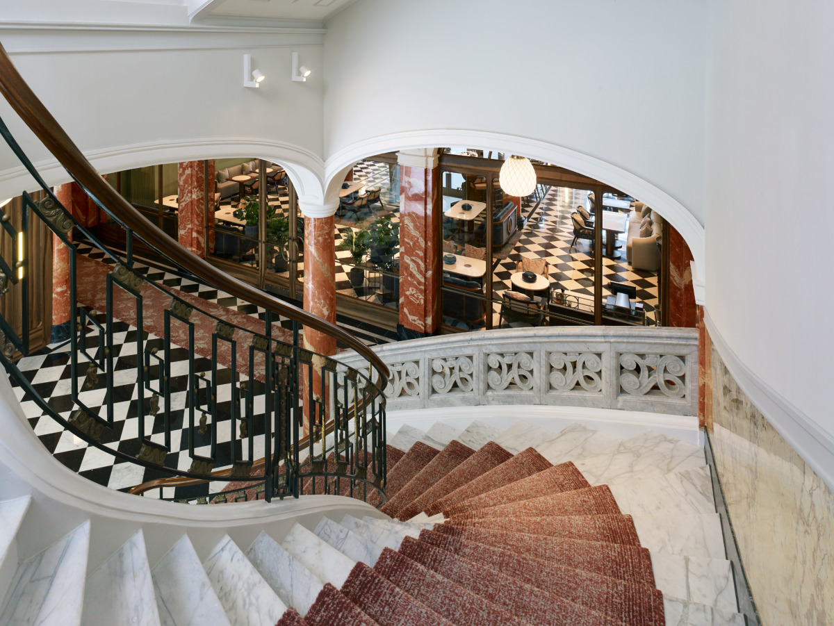Nur noch Teile des Bestands von 1906 waren 2018 erhalten. Das Haupttreppenhaus mit Stuckmarmor gleicht nach der Restaurierung wieder seinem Ursprungszustand. Das bauzeitliche Treppengeländer zeigt sich wieder in dunkelgrünem Metall mit hölzernem Handlauf