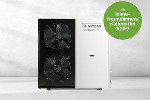 Die Luft-Wasser-Monoblock-Wärmepumpe Effenca HT vom münsterländischen Unternehmen Remeha nutzt auch das klimaschonende Kältemittel R290, also Propan, mit einem Global Warming Potential (GWP) von unter 3. Mit Vorlauftemperaturen von bis zu 80 °C ist neben einer hybriden Anwendung mit Spitzenlastkessel auch ein monovalenter Betrieb in weniger gut gedämmten Gebäuden inklusive Warmwasserbereitung möglich. Bestehende Heizkörper sind damit weiter nutzbar und Umbaumaßnahmen auf Flächenheizungen nicht erforderlich.