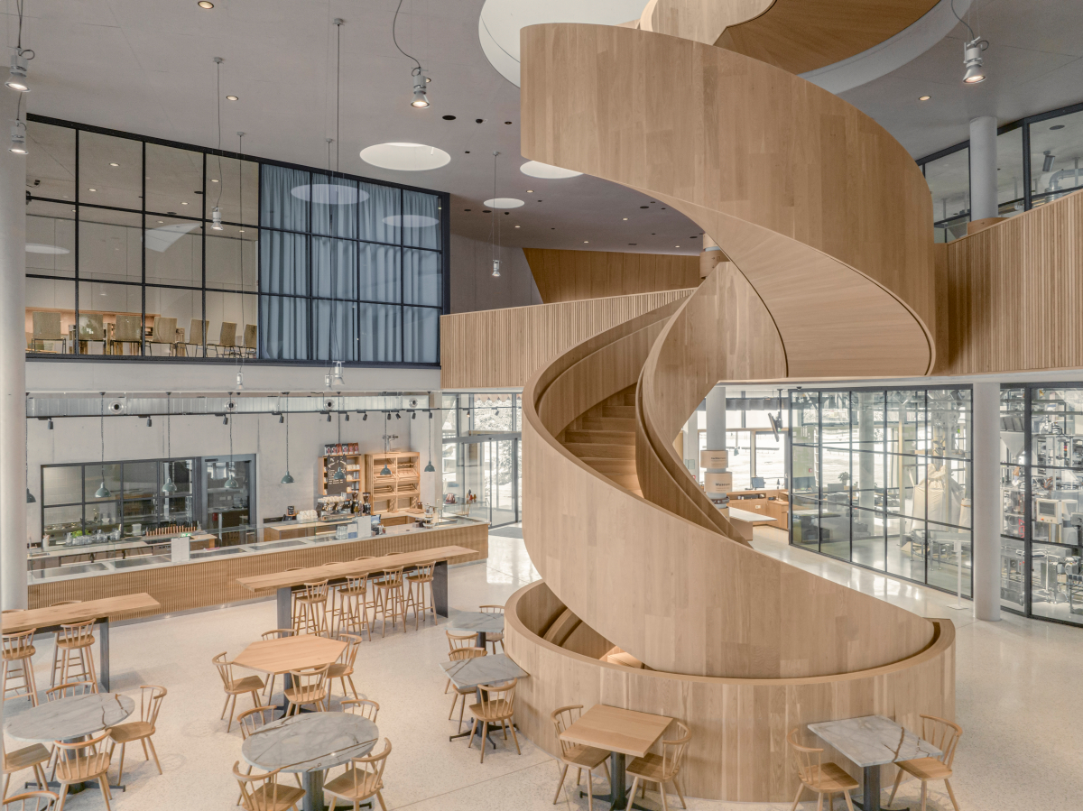 Zentrum des Gebäudes bildet die Rapunzeltreppe. Zu ihren Füßen erstrecken sich die öffentlichen Bereiche. Die doppelgeschossige Verglasung der Rösterei (r. im Bild) verwehrt zwar Unbefugten den Eintritt, nicht aber dem Kaffeearoma den Ausgang