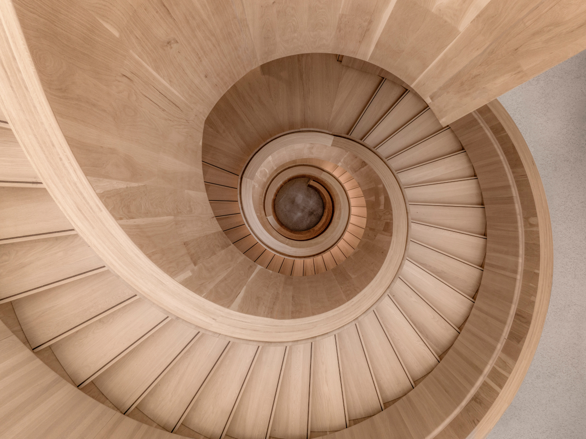 Das Erd- und die Obergeschosse sind so organisiert, dass die unterschiedlichen Bereiche sich stets zur Mitte ausrichten, also dort, wo sich die Gebäudeflügel treffen. Diese scheinen sich wiederum zentrifugal aus der mittig platzierten, freistehenden Wendeltreppe zu entwickeln, die sich gleichberechtigt zu den verschiedenen Ebenen und Funktionen des Gebäudes ausrichtet. Kneift man die Augen etwas zu, erinnert ihre Form an Rapunzels märchenhaftes Haar. Ihre Konstruktion, die auf Stahlverbindungen verzichtet und aus Vollholz realisiert wurde, spiegelt wiederum die Marke Rapunzel und ihren Ökologiegedanken wider.