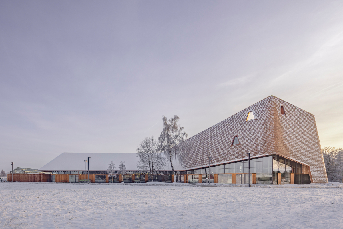haascookzemmrich STUDIO2050 haben sich von Beginn des Entwurfsprozesses an die Frage nach der Regionalität der Ressourcen gestellt. Dabei ging es nicht nur um das eingesetzte Material, sondern auch um die technische Expertise und die lokale Baukultur, die im Entwurf und im Bauprozess gleichermaßen berücksichtigt wurden – von der Skizze bis zum Transport. Material und Arbeitskräfte wurden in einem Radius von 25 bis 30 km um die Baustelle herum gesucht – vom Recyclingbeton über das Holz für die Dachkonstruktion bis hin zu den Inneneinrichtungen. Für Farben und Beschichtungen wurde eine mineralische, ökologischere Variante gewählt. Bei der Dämmung entschieden sich die Architektinnen für einen natürlichen Baustoff: recycelten Schaumglasschotter.