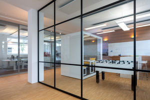 Das Einscheiben-Glastrennwand-System 3400_Plus von Strähle zeichnet sich durch ausschließlich verschraubte Verbindungen und die Unterteilung in kleinere, leichtere Glassegmente aus. Hinzu kommt ein schlankes Design, mit Vertikal- und Horizontalprofile einer Ansichtsbreite von 35 mm bei einer Bautiefe von 40 mm. Die neue Glastrennwand ist kreislauffähig, also wiederverwendbar. Dabei ist das System 3400_Plus gut geeignet für Projekte, die eine hohe Flexibilität der Wandsysteme erfordern, wie z. B. beim Bauen im Bestand. Die Voraussetzung dafür schafft eine Grundkonstruktion, die es erlaubt, alle Vertikalprofile mit gleichem Maß zu fertigen und Toleranzen durch ein Eintauchen der Profile in das Deckenprofil aufzunehmen. Mit drei übereinander angeordneten Glasfeldern kann die Bauhöhe bis zu 3 m betragen. Die Oberflächen der Profile sind wahlweise eloxiert oder pulverbeschichtet, die Dichtungen sind in Grau und Schwarz lieferbar. Als Gläser stehen ESG in 10 mm und VSG-Schalldämmgläser mit 12 oder 16 mm zur Verfügung. Damit lassen sich Schallschutzwerte bis zu 40 dB Rwp erreichen. Optional steht das System 3400_Plus auch als Variante bereit, die es ermöglicht, die Wand mit Organisationselementen, Whiteboards und Fachböden, sowie Absorberelementen des Systems 7000 zu kombinieren.