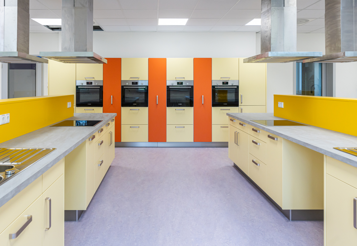Im Erdgeschoss reihen sich entlang des Mittelflurs drei fast 90 m² große, stützenfrei konzipierte Fachklassenräume für Musik und Holzbearbeitung, ein Fachraum für Naturwissenschaften, für das Fach Wirtschaft-Arbeit-Technik (WAT) sowie fürs Basteln und Werken aneinander. Angrenzende Sammlungsräume für Musikinstrumente mit Übungsmöglichkeit zudem Lernwerkstätten, Lager- und Nebenraumzonen, Sanitär- und Technikflächen ergänzen das Raumprogramm.