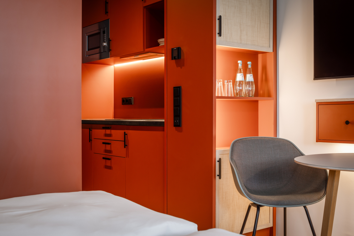 „Es gibt keine klassische Lobby“, sagt Jörg Moser. Stattdessen herrschen Self-Check-in-Terminals, Long-Stay-Ausstattung und multifunktionale Räume vor. Zielgruppe von Boardinghaus und Hotel sind überwiegend Geschäftsreisende und Handwerker – einige Apartments sind speziell für deren Bedürfnisse konzipiert.