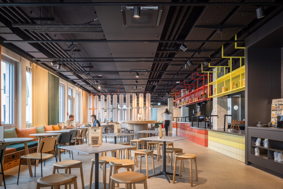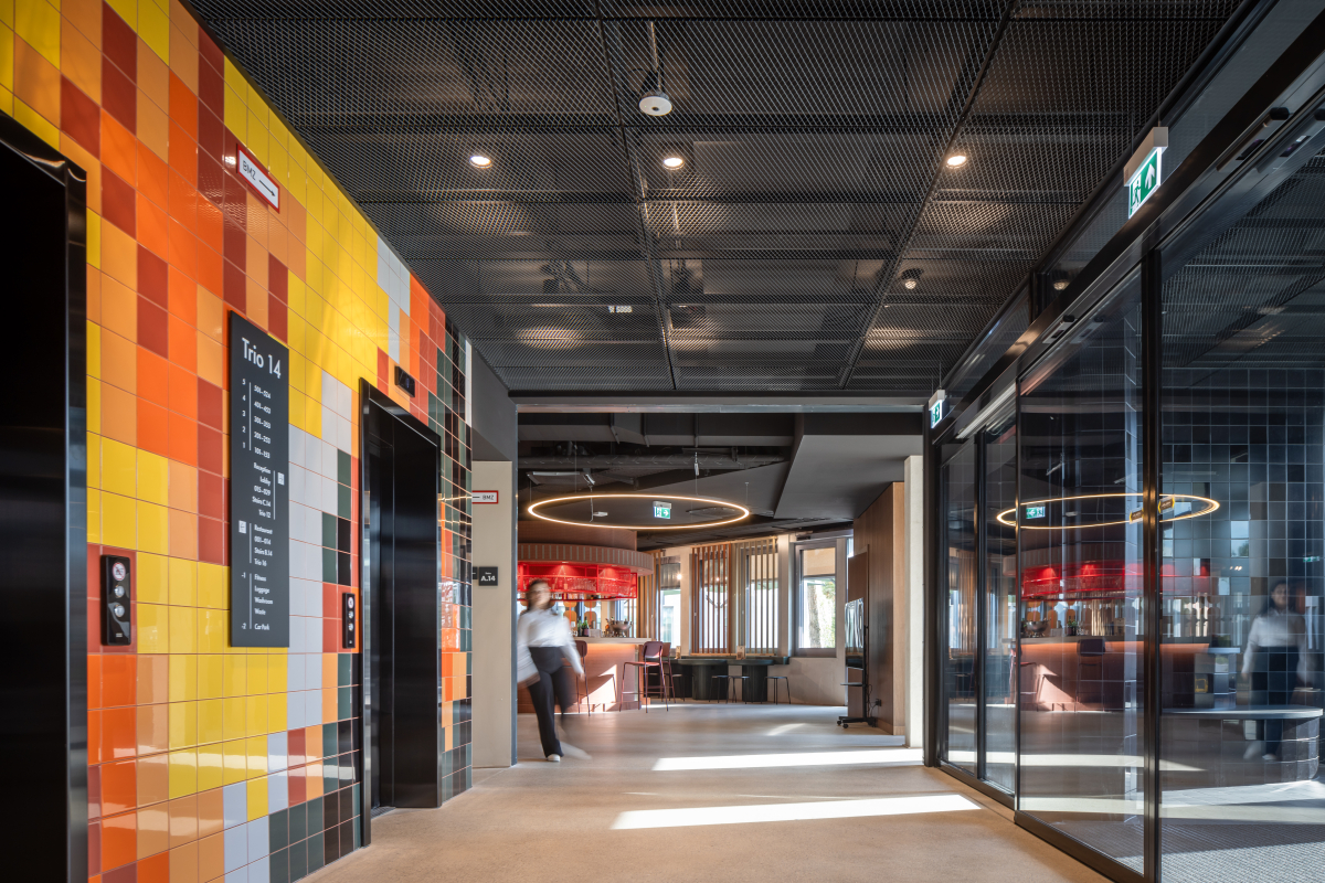 Elemente wie bunte Fliesen an den Liften, Shutter aus Holz und filigrane dreieckige und zweifarbige Lamellen als Verkleidung geben dem Interieur etwas Verspieltes. Die von Olufemi Moser entworfenen Leitdetails für die Einbauten sind auf die Möbel – Sessel, Stühle und Beistelltische – von der dänischen Firma Hay und die Textilien von Kvadrat abgestimmt. Einige Möbel und Leuchten wurden eigens von Olufemi Moser entworfen.