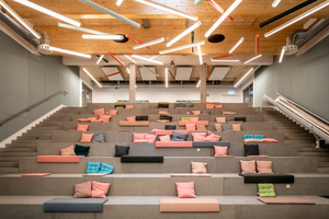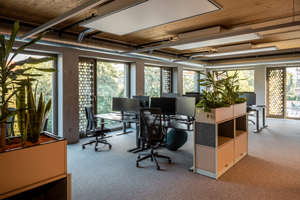 Die neue Unternehmenszentrale der sevDesk GmbH auf dem alten Schlachthofareal CANVAS 22 in Offenburg wurde in knapp zwei Jahren nach den Plänen des Architekturbüros Müller + Partner errichtet. Der viergeschossige Komplex ist ein Hybridbau aus Holz und Beton und bietet insgesamt ca. 4 700 m2 Nutzfläche. Die gezackte Kaltfassade mit großen Glasflächen und Lochblechen vor den Öffnungselementen wurde um vertikale, sich selbstbewässernde Pflanzenpaneele ergänzt und 60 Prozent der Dachfläche mit Photovoltaik ausgestattet. Insgesamt bietet das neue Büro mehr als 300 Arbeitsplätze, über 20 Meetingräume und modernes Technikequipment. Neben einem Atrium mit breiter Sitztreppe und Rutsche an der Seite gibt es mehrere offene Workspaces, Social Zones wie eine Gaming-Ecke mit Bar, ein Bistro, aber auch stille Fokuszonen mit Schreibtischen und Sitzmöglichkeiten. Für die Flexibilität der Bürolandschaften installierte die Stuttgarter Kiefer Klimatechnik GmbH das multifunktionale 4-in-1-System Indusail Sonic aus aktiven Akustiksegeln, die Lüftung, Kühlung und Lichtreflexion vereinen. Bei sevDesk sorgen dabei knapp 200 dieser Segel für eine gute Raumakustik, die insbesondere bei Großraumbüros eine wichtige Rolle spielt. Die Unterseite des Segels besteht dabei aus einem offenporigen Absorbermaterial mit Glasvlieskaschierung, wodurch hohe Schallabsorptionswerte erreicht werden. Über eine integrierte Umluftkühleinheit wird die Raumluft gekühlt und durch den Zuluftanschluss die aufbereitete Frischluft der zentralen RLT-Anlage eingebracht, um den Luftwechsel zu gewährleisten. Dieser erfolgt ohne spürbaren Luftzug in feinen Einzelstrahlen über die hochinduktiven Schlitzauslässe mit speziell entwickelter Ausblasgeometrie. Zusätzlich unterstützt Indusail Sonic durch seinen Lichtreflexionsgrad von mehr als 90 Prozent alle wesentlichen Beleuchtungsarten. Die Sichtinstallation der Versorgungsmedien Luft und Wasser erfolgt als umlaufende Ringleitung an den Randflächen der Räume. Um die akustische Schwächung der Gipskarton-Ständerwände der einzelnen Räume zu mindern, wurde eine integrierte, schalltechnisch hochwirksame und nicht brennbare Innenauskleidung eingesetzt, womit eine Normschallpegeldifferenz von 40 bis 50 dB je nach Typ und Einbaudetail erreicht wird. Dabei erfolgte der Einbau der Luft-Überströmelemente aus verzinktem Stahlblech flächenbündig in die Trockenbauwände, wobei ein 20 mm breiter Luftschlitz spannungsfrei in den Ausschnitt der Gipskarton-Beplankung eingebracht wurde.