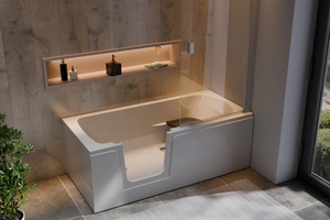 Entwickelt von dem Wannenspezialisten BörSting GmbH, Schöppingen, erlaubt die Badewanne Buffalo der Duschwelten Breuer GmbH & Co. KG barrierearmes Baden sowie Duschen auf großzügiger Fläche. Ihre Zugangstür aus 8 mm starkem Einscheiben-Sicherheitsglas (ESG) lässt sich links, rechts oder mittig platzieren. Die Tür ist mit einer hochwertigen Dichtung aus dauerelastischem Silikon versehen und schwingt an verchromten Messingscharnieren nach innen. So ergibt sich eine bequeme Einstiegshöhe von nur 19,5 cm.