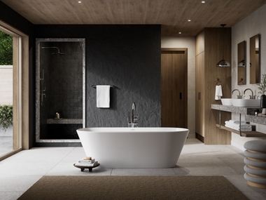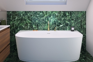 Die Badewanne Venice F Wand von repaBAD besteht aus durchgefärbtem Mineralwerkstoff und kombiniert die Anmutung einer freistehenden Wanne mit der platzsparenden Funktionalität einer wandmontierten Lösung und bietet so Liegekomfort auf kleinstem Raum. Mit ihren filigranen Seitenrändern und einem Gewicht von ca. 80 kg ist sie für eine Mineralwerkstoffwanne verhältnismäßig leicht und kompakt. Sie misst dabei 160 x 85 cm. Die integrierte Ablagefläche an der Wandseite ermöglicht zusätzlich die Installation der Wannenrandarmatur Aqua W2 von repaBAD.