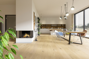Durch patentierte Produktionsprozesse präsentiert ter Hürne den ersten wasserbeständigen Echtholz-Hybridboden, der dank Aqua-Seal-Trägerplatte unbeschadet bleibt, selbst wenn das Wasser mal nicht sofort weggewischt wird. Von der versiegelten Oberfläche über die hochverdichtete Mittellage bis hin zur Spezial-Profilierung ist Hywood auf Wasserabwehr eingestellt. Zudem ist der Boden druck- und kratzbeständig und kommt mit neu entwickelten Porenschutz. Hywood besteht zu 98 Prozent aus Holz und kann in den Materialkreislauf zurückgeführt werden.