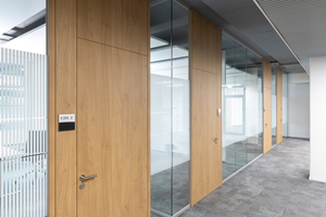 Zum Einsatz kamen dafür auch Trennwände der feco-Gruppe, während für den Ausbau die transparente Nurglaskonstruktion fecoplan verbaut wurde. Die verglasten Flurwände mit 16 mm Verbundspezialglas und einem Schalldämmprüfwert von Rw,P = 42 dB bieten dabei ausreichend Diskretion. Für das Projekt entwickelte feco zudem eine mit Holzdekor ummantelte fecoplan-Türzarge mit integrierter Türblattoberblende und in die Zarge integrierten Technik-Türseitenteil. Oberblende und Technikpaneel sind analog zum Türblatt mit einem Eiche-Holzdekor belegt und wie das Türblatt beidseitig zargenbündig. Das Furnierbild des Türblattes setzt sich bildhaft auf der Oberblende fort. Durch die eigene Produktion der Türblätter kann feco den Einsatz von Holz aus nachhaltiger Forstwirtschaft sicherstellen, zumal die Verwendung von FSC-zertifizierter Holzwerkstoffen eines der Nachhaltigkeitskriterien für die angestrebte LEED Gold Zertifizierung des Projektes war.