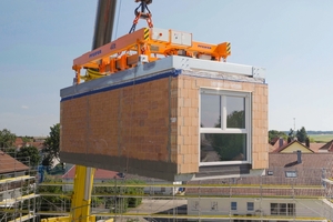 Leipfinger-Bader hat die Serienproduktion von rückbaubaren Ziegel-Raummodulen aufgenommen. Diese werden ab Werk schlüsselfertig ausgestattet, inkl. Sanitäranlagen, Bodenbelägen sowie Innenausbau, und ermöglichen dadurch nach der Montage auf der Baustelle den zeitnahen Einzug. Zudem wird auf eine Hybridbauweise mit Betonbodenplatten, massiven Ziegelwänden und einer tragenden Holzdecke gesetzt. Die Innenflächen sind dabei werkseitig verputzt. Die ersten gefertigten Module verfügen über eine Grundfläche von 27 m2, sind jedoch individuell je nach Projektanforderung anpassbar – Grundrisse, Ausstattung und Ausbaustand der Raummodule können projektbezogen geplant und ausgeführt werden. Die für die Module verbauten Mauerziegel sind langlebig, robust, feuerbeständig und schallreduzierend. Aufgrund ihrer guten Wärmespeicherung tragen sie zu einer gleichmäßigen Innentemperatur bei, was für einen reduzierten Energieverbrauch sorgt. Auf ein Wärmedämmverbundsystem kann verzichtet werden. Dank des Außenmauerziegels Coriso W08 in der Wandstärke 36,5 cm erreichen sie ohne zusätzliche Dämmung die Effizienzhaus-Stufe 40 der KfW mit Qualitätssiegel Nachhaltiges Gebäude (QNG) und sind somit förderfähig. Die fertigen Raummodule werden separat gelagert und anschließend per Tieflader zu ihrem Einsatzort transportiert und dort mithilfe eines Autokrans montiert.