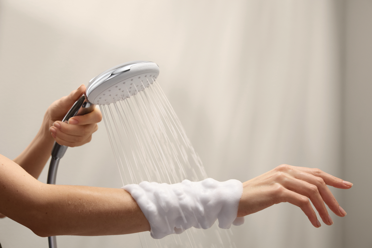 Die Duschtechnologie Grohe Purefoam verwandelt Seife von Kinuami beim Duschen in eine Schaumwolke. Das System lässt sich in Duschen integrieren, wobei lediglich der Wasserschlauch an die Handbrause...