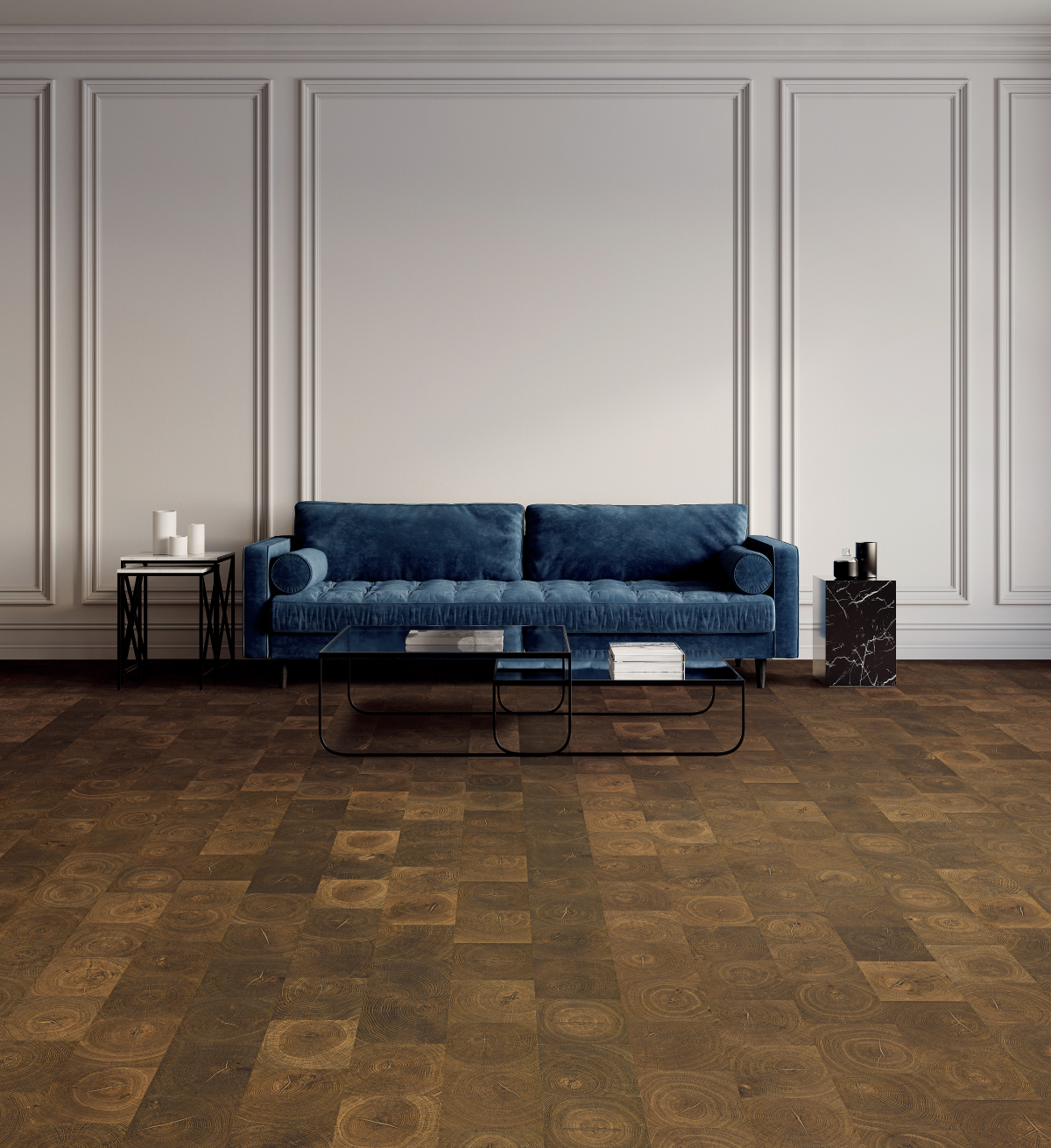 Die quadratischen Elemente des Parketts Carré von Haro bestehen aus quer zur Faser geschnittenen Eichenblöcken und bieten eine lebendige Textur mit sichtbaren Jahresringen und markanter...