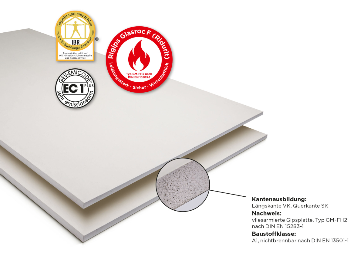 Bei Rigips Glasroc F (Ridurit) handelt es sich um eine vliesarmierte Gipsplatte nach DIN EN 15283-1 Typ GM-FH2 mit verringerter Wasseraufnahmefähigkeit und verbessertem Gefügezusammenhalt bei hohen...