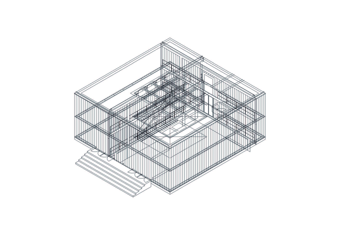 Mit seiner Grundfläche von 15 mal 15 Metern folgt das Gebäude einer klaren geometrischen Idee. Über einen Brückensteg vom Treppenpodest des Altgebäudes gelangt man auf die Galerieebene des Pavillons. Eine Freitreppe führt von hier aus auf die Hofebene. Weite Flügeltüren öffnen sich zum grünen Innenhof. Gerade diese Offenheit prägt den Charakter des Gebäudes. Bei Veranstaltungen verschwimmen die Grenzen zwischen Innen und Außen. Und das Äußere des Pavillons mit seiner Fassade aus Glasstegplatten verändert sein Gesicht je nach Tageszeit und Lichteinfall: tagsüber schillernd-reflektierend, nachts als leuchtender Kubus.