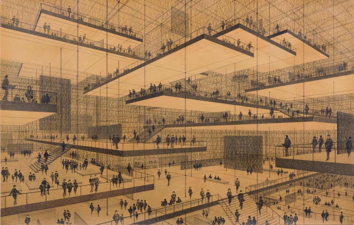 Conrad Roland, 1964 Ausstellungshalle mit „schwebenden“ Ebenen in einem Raumnetz aus Stahlseilen, Innenperspektive Bleistift auf Lichtpause Dauerleihgabe der Freunde des Deutschen Architekturmuseums Schenkung die Freunde des Deutschen Architekturmuseums, 2019