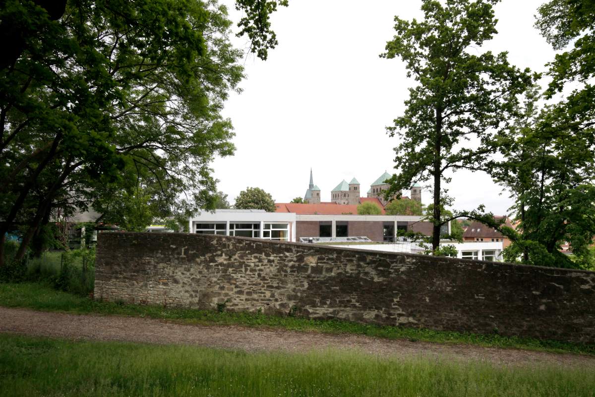 Der in Ost-West-Richtung gesetzte, teils auf der historischen Stadtmauer errichtete Hauptriegel steht auf dem topografisch höchsten Punkt des historisch bedeutsamen Geländes, Blickrichtung UNESCO Weltkulturerbe „Dom und Michaeliskirche in Hildesheim“